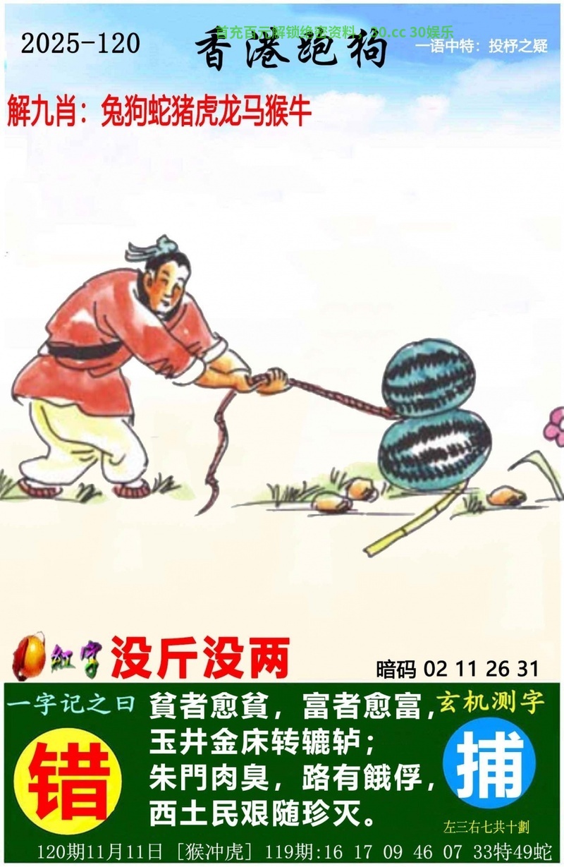2025-110期:在高速行驶的火车上,一个老人不小心把刚买的新鞋从窗口掉了一只,周围的人倍感惋惜,不料老人立即把第二只鞋也从窗口扔了下去。这个举动让人大吃一惊。老人解释说:这一只鞋无论多么昂贵,对我而言已经没有用了,如果有谁能捡到一双鞋子,说不定他还能穿呢! 解:本期幽默玄机中周围的人对老人掉了的鞋子感到惋惜,有点狗拿耗子多管闲事,毕竟丢鞋的人已经想开,本期解得狗肖,特码开狗20! |